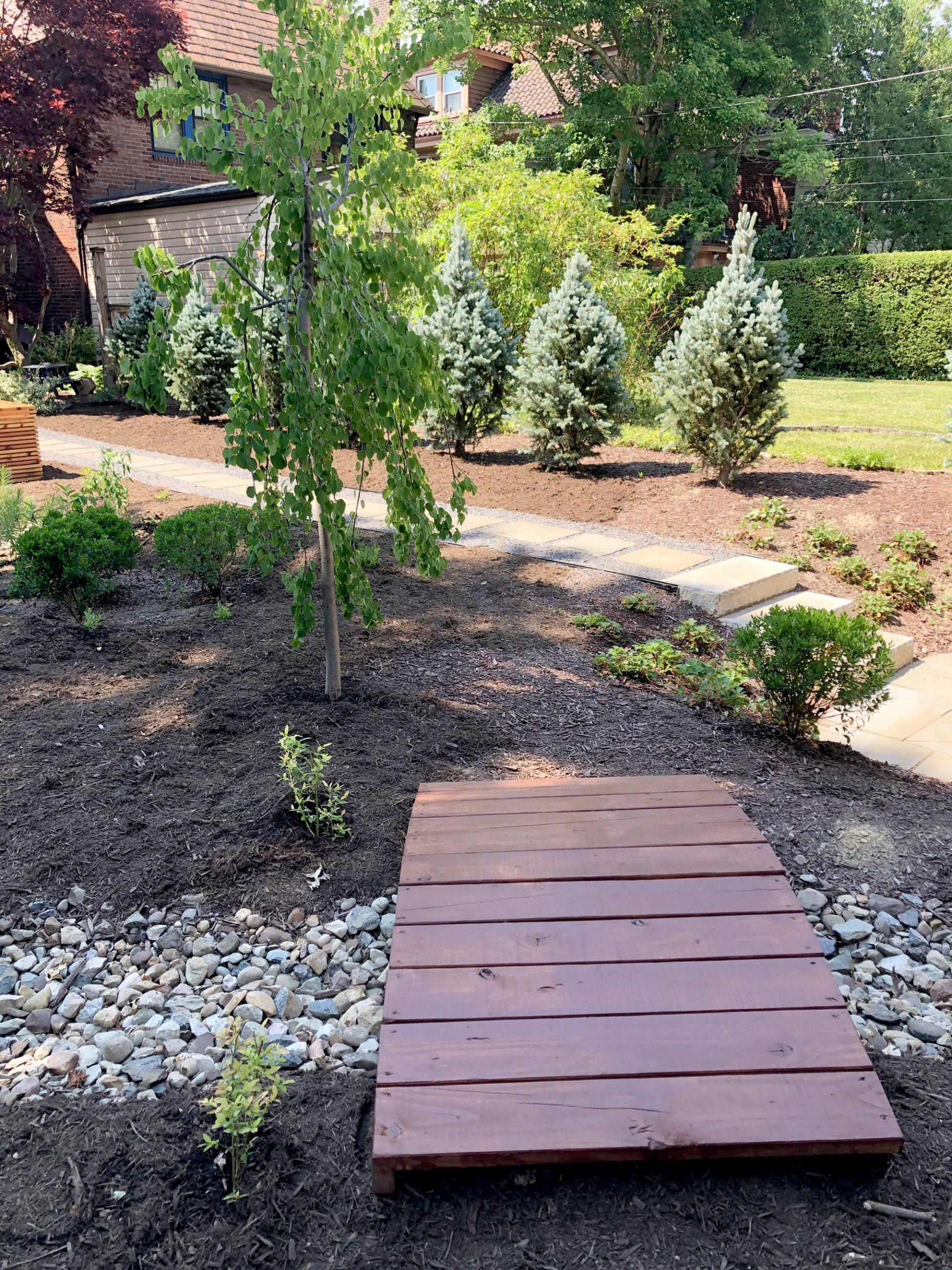 The nature play elements include a bamboo tee-pee, covered with vining honeysuckle, and a stone spiral maze winding around an existing tree. Two large handmade planter boxes are used by the family to experiment with growing their own food. It was important that the children be able to move through the space freely, without worrying too much about crushing any plants. A beautiful handmade bridge spans the width of the garden; a smaller footbridge jumps a swale further up. At the time of installation, the ground was covered in a layer of mulch, to discourage weeds, but we are planning to replace this in 2021 with a softer (and more child friendly!) ground cover.