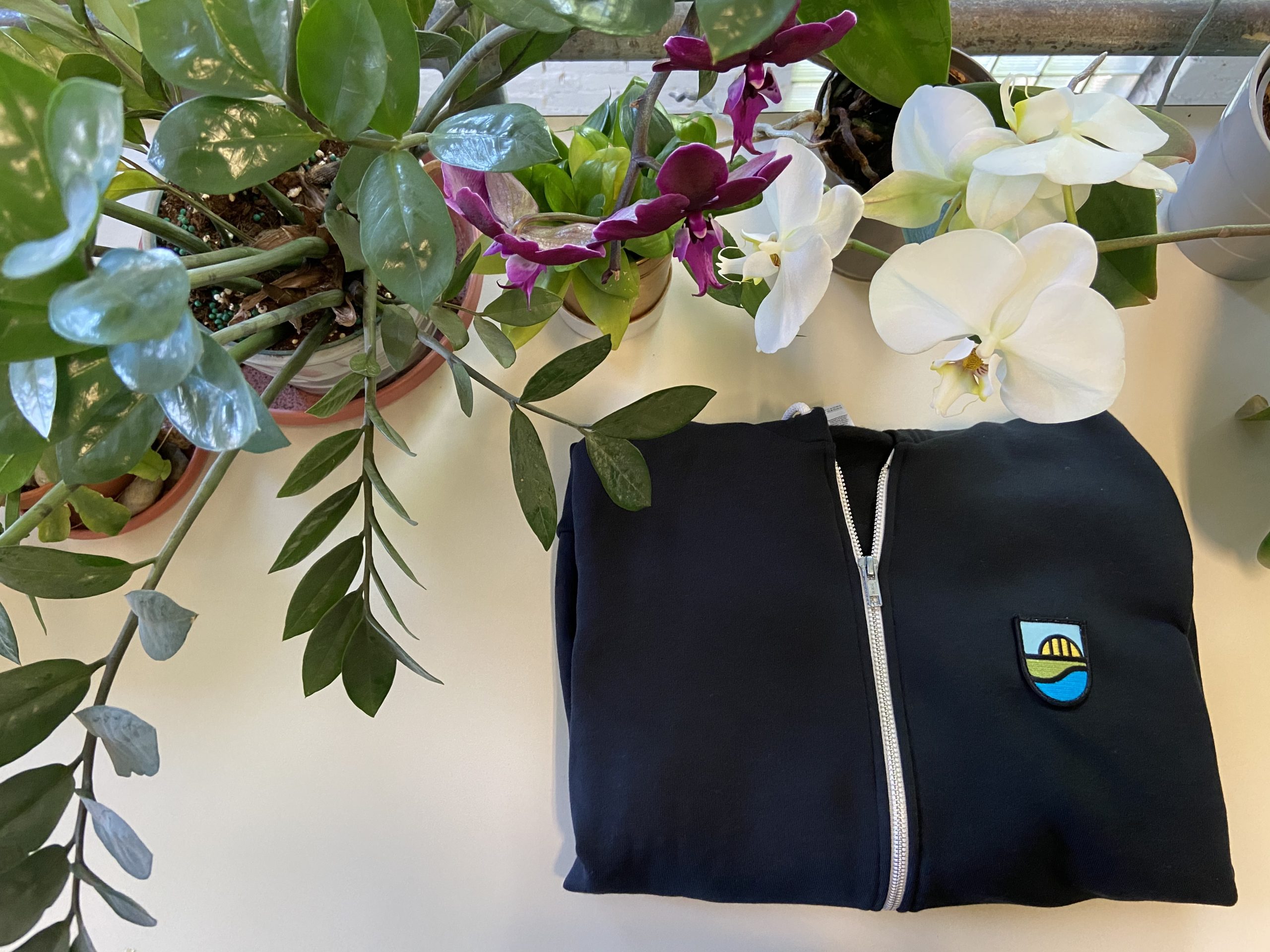 Black zip-up hoodie made of 50/50 Cotton Polyester blend with UpstreamPgh shield patch.