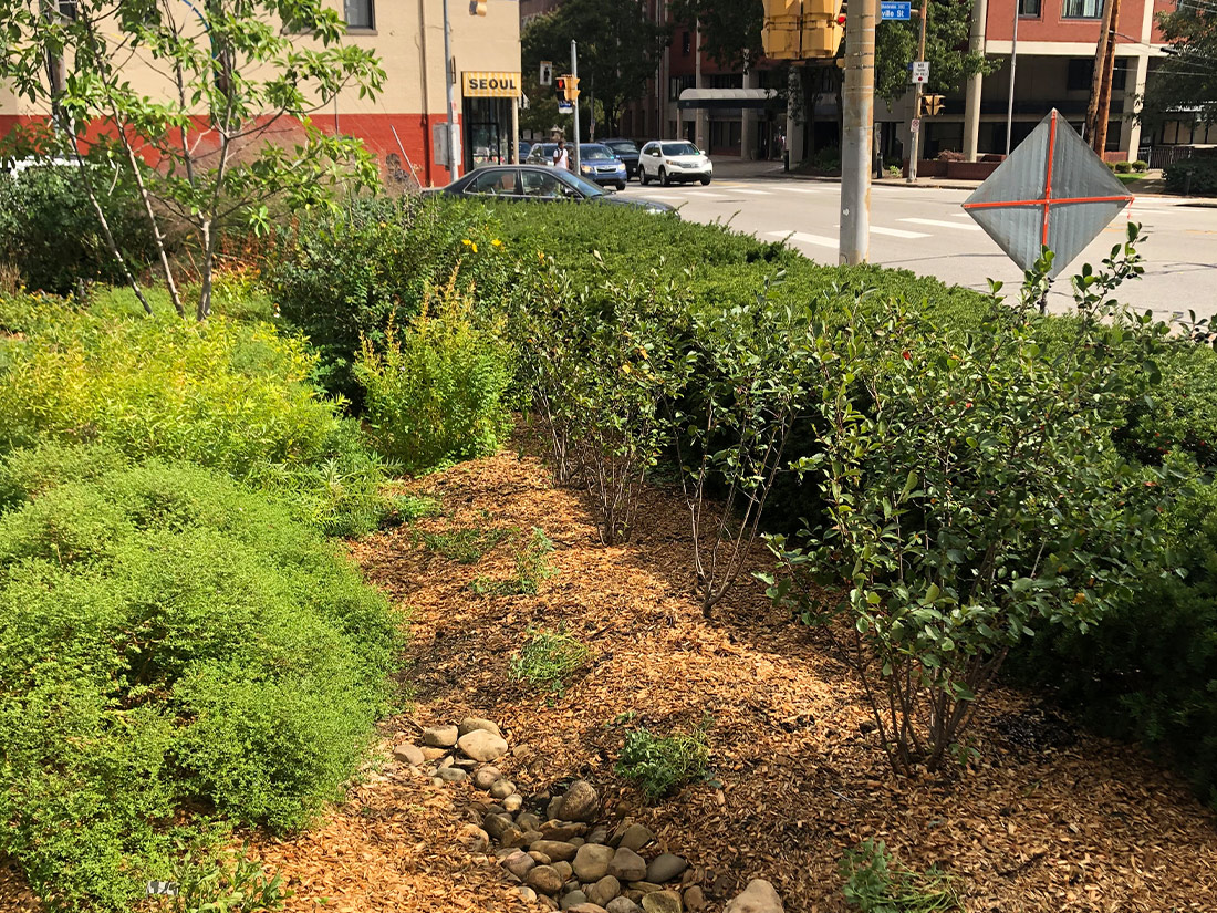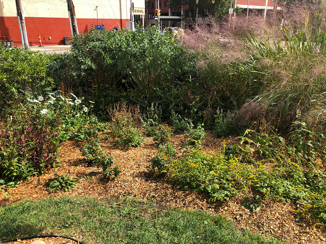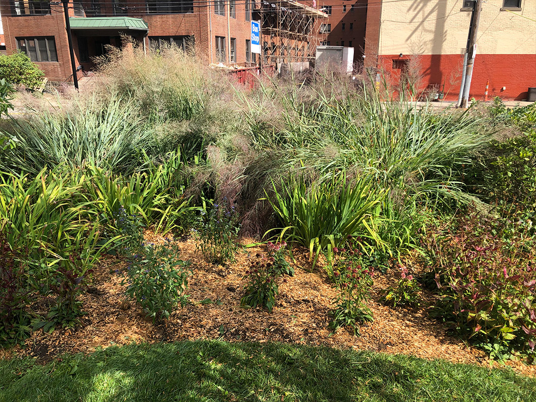 We began by designing and installing a 900 sq. foot rain garden at this apartment complex in the heart of Oakland. The facility managed all sheet flow coming off the front lawn. To maximize infiltration through the clay soils at the site, we constructed several ‘stone chimneys’ reaching 5-6 feet underground. When the garden was completed, we worked with residents to train them for long term maintenance; they are also tracking rainfall with a rain gauge at the site.