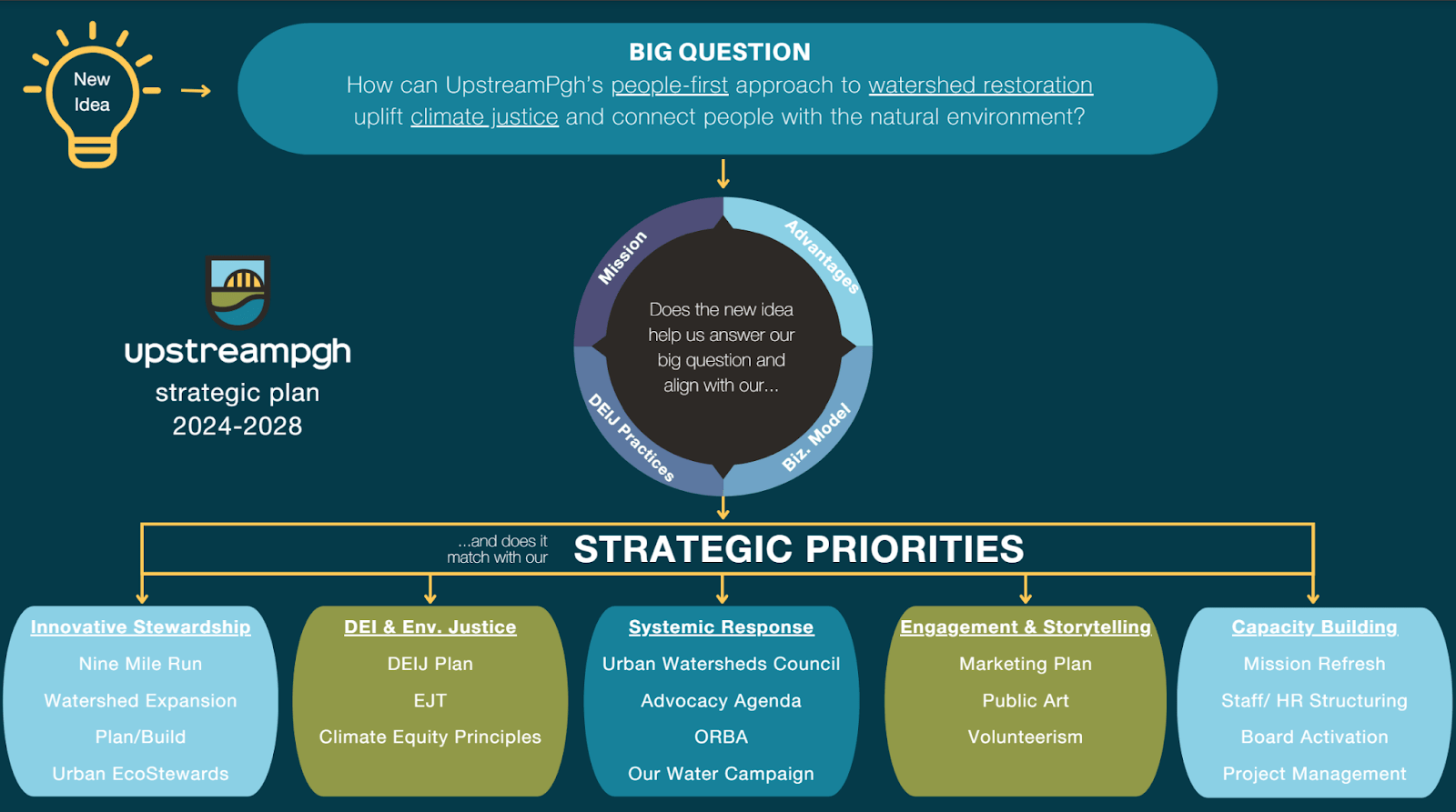 T he team at UpstreamPgh is excited to roll out its 2024-2028 strategic plan. This new plan advances our people-first approach to watershed restoration to uplift climate justice and connect people with the natural environment.